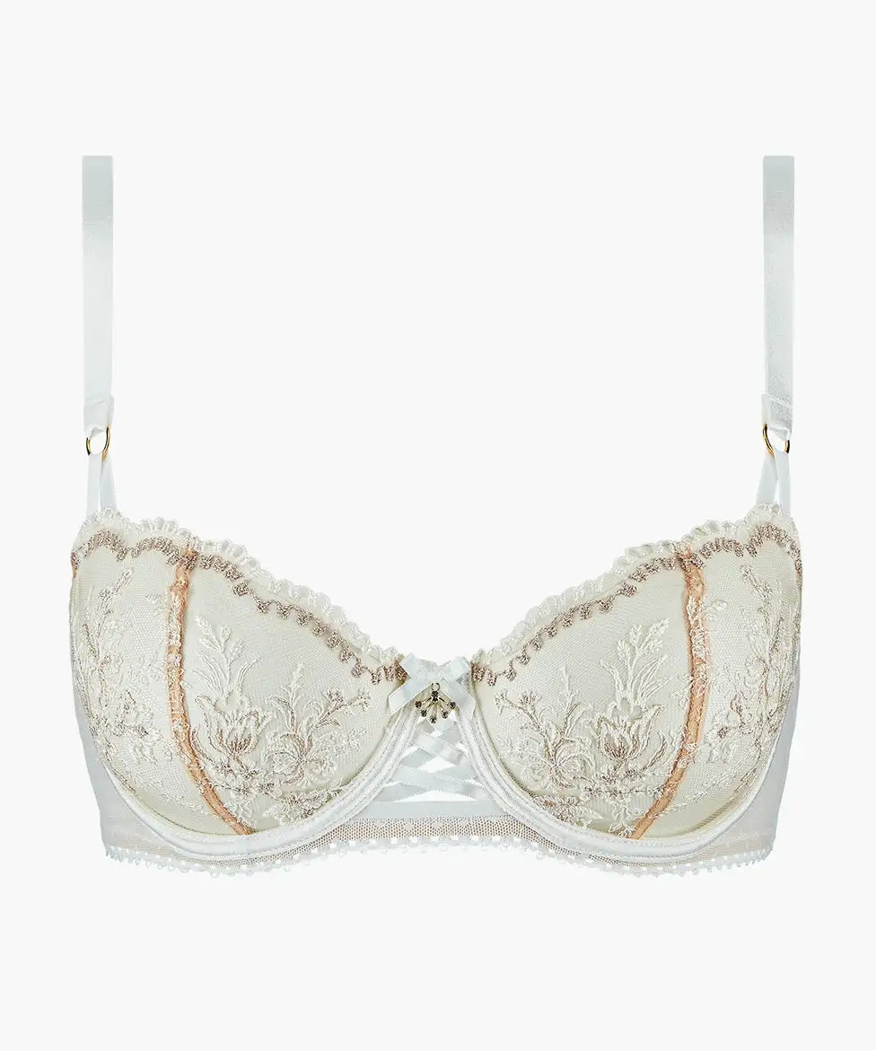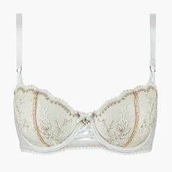 The stunning Underwired Half-Cup bra from the Tresor Infini collection features luxurious floral embroidery, enhanced with graphic scalloping and finished with a delicate, glittering lurex thread. Extraordinarily refined, it enhances the bust with barely-there tulle for a sensual look. Pair with the matching Tresor Infini Tanga for a Parisian chic look.