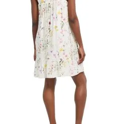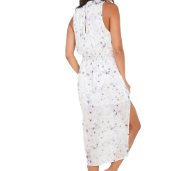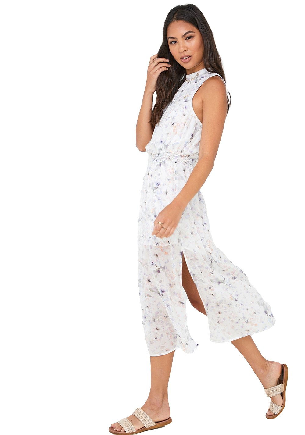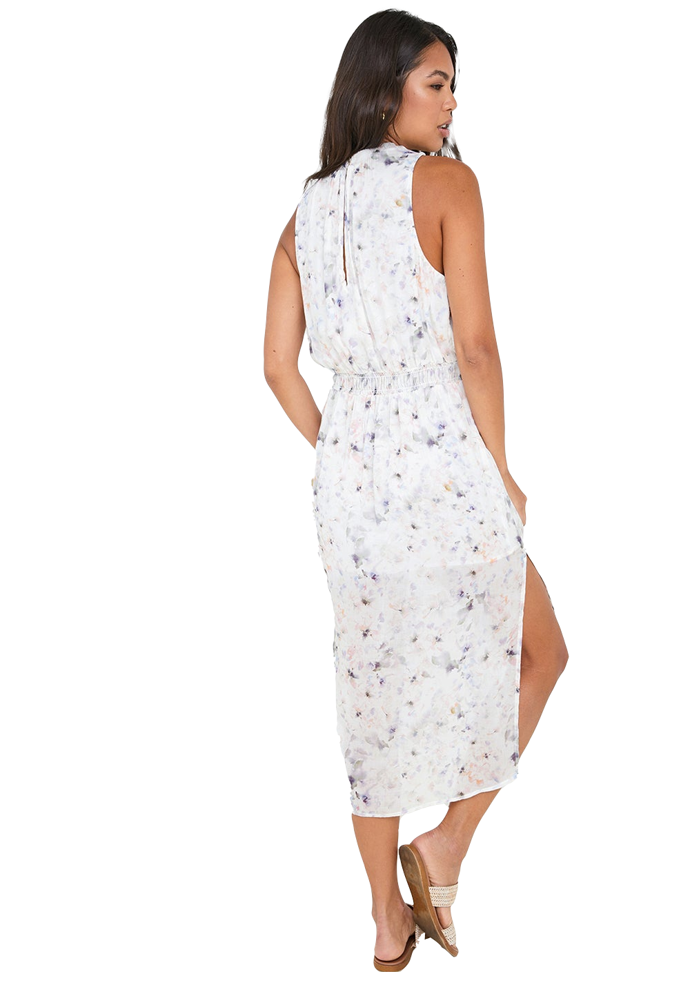 This sleeveless crew neck midi dress is perfect for a garden party in a sheer floral print fabric!Â