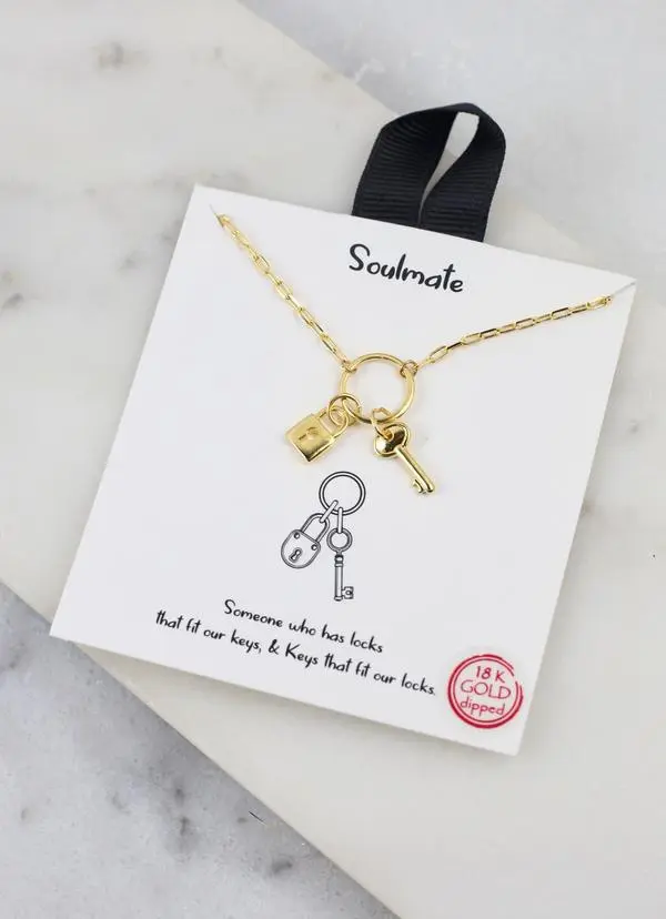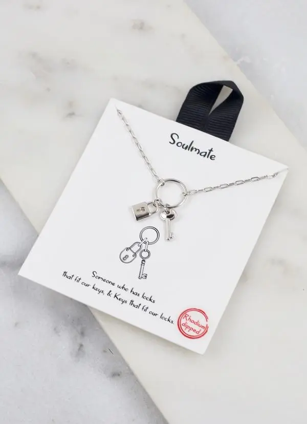 This lock and key charm necklace comes on a card with an inspirational quote that reads, “Someone who has locks that fit our keys, & Keys that fit our locks.” Available in Gold or Silver. Gold: It is 18 K gold dipped as well as lead and nickel free.Silver: It is rhodium dipped as well as lead and nickel free.