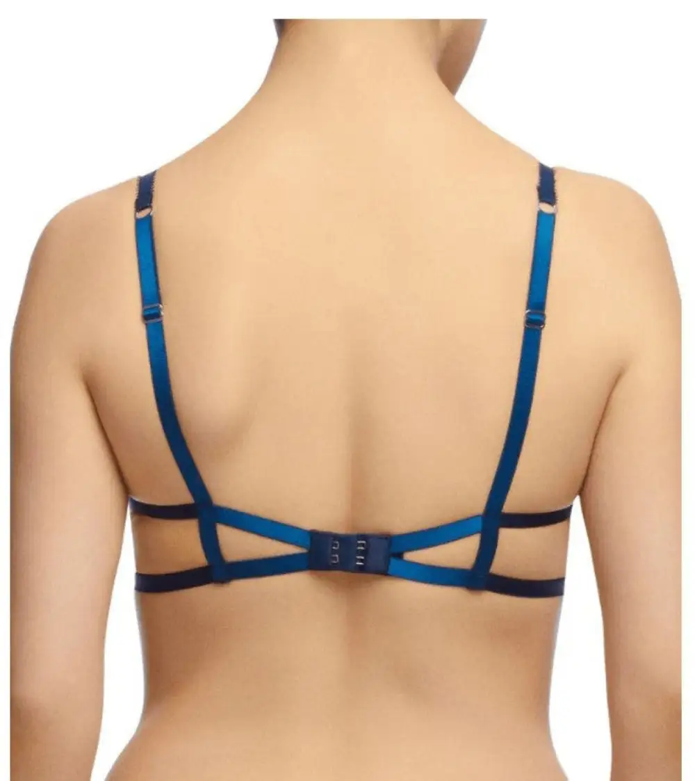 Dita Von Teese Femmoiselle is made from a 2 tone embroidery with subtle lurex highlights on a very fine tulle that disappears on the body. The detailed embroidery is then contrasted with beautiful dramatic design lines. The collection has fine picot straps and is embellished be a satin bow with heirloom sapphire blue trinket. Can you spot Dita’s stiletto stitched into the embroidery?