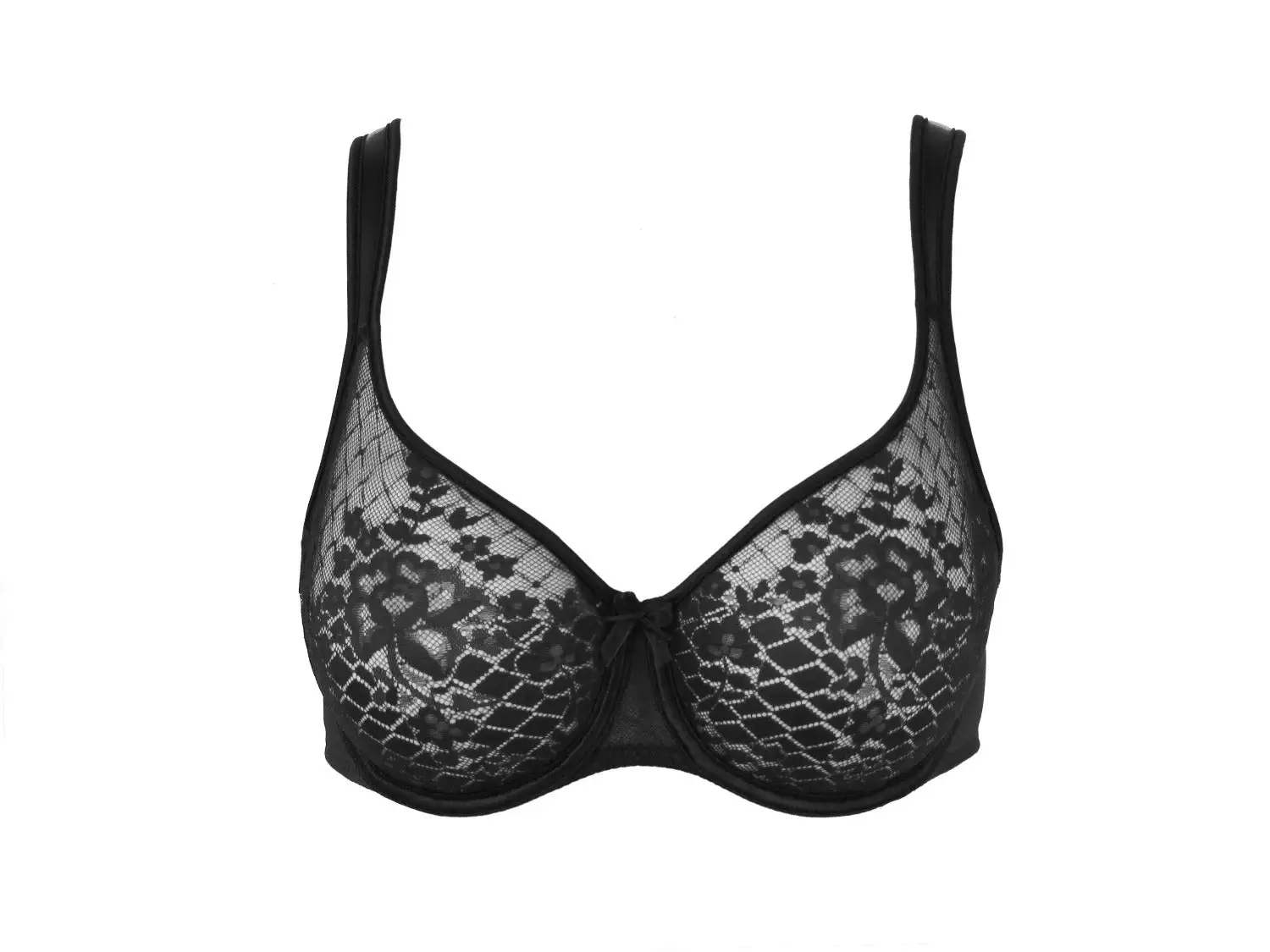 - Satin trim surrounds the cups and front of shoulder straps for a glamorous touch.