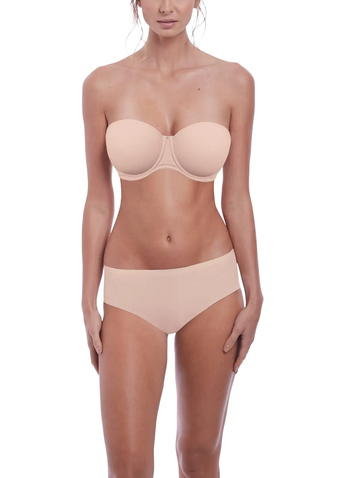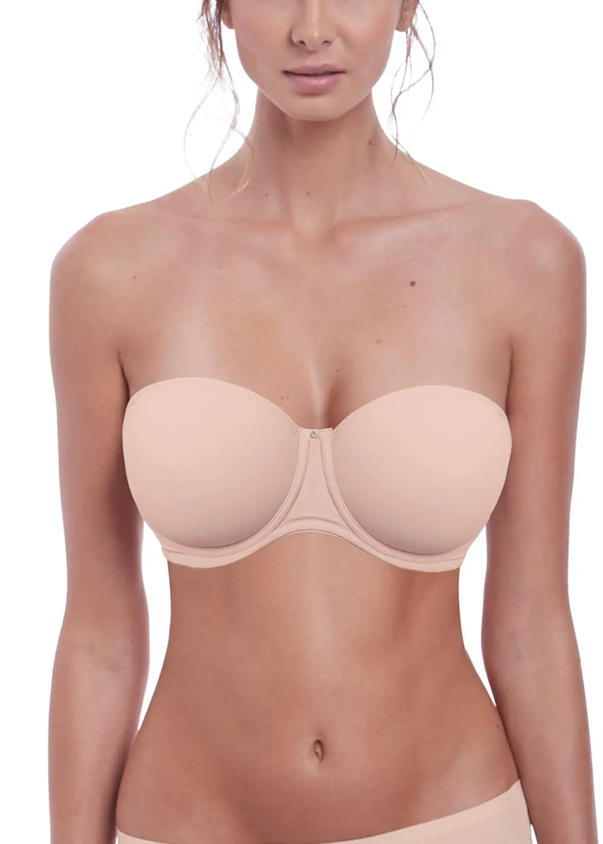 The Aura Moulded Strapless Bra in a Natural Beige hue creates a beautifully rounded, smooth profile. Crafted from soft fabric with a subtle sheen, alongside a padded hook and eye for great support. Fully adjustable, detachable shoulder straps offer versatility for every occasion.