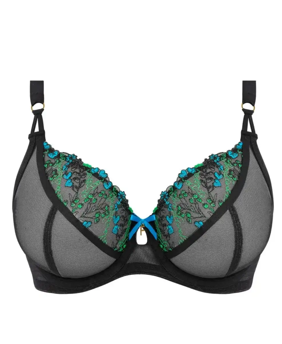 Pretty embroidered florals and lovely hearts accent a mesh plunge bra that supports and shapes a fuller bust.
