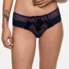The Thelma collection highlights Huit’s heritage of fine craftsmanship, translating this with a youthful twist. Rich floral embroidery adds precious accents to these contemporary tangas. These low-rise tangas are an everyday staple made romantic with a tulle back and a trail of delicate flowers that dance across the skin in the front. They have a low-rise waist and offer minimal coverage.