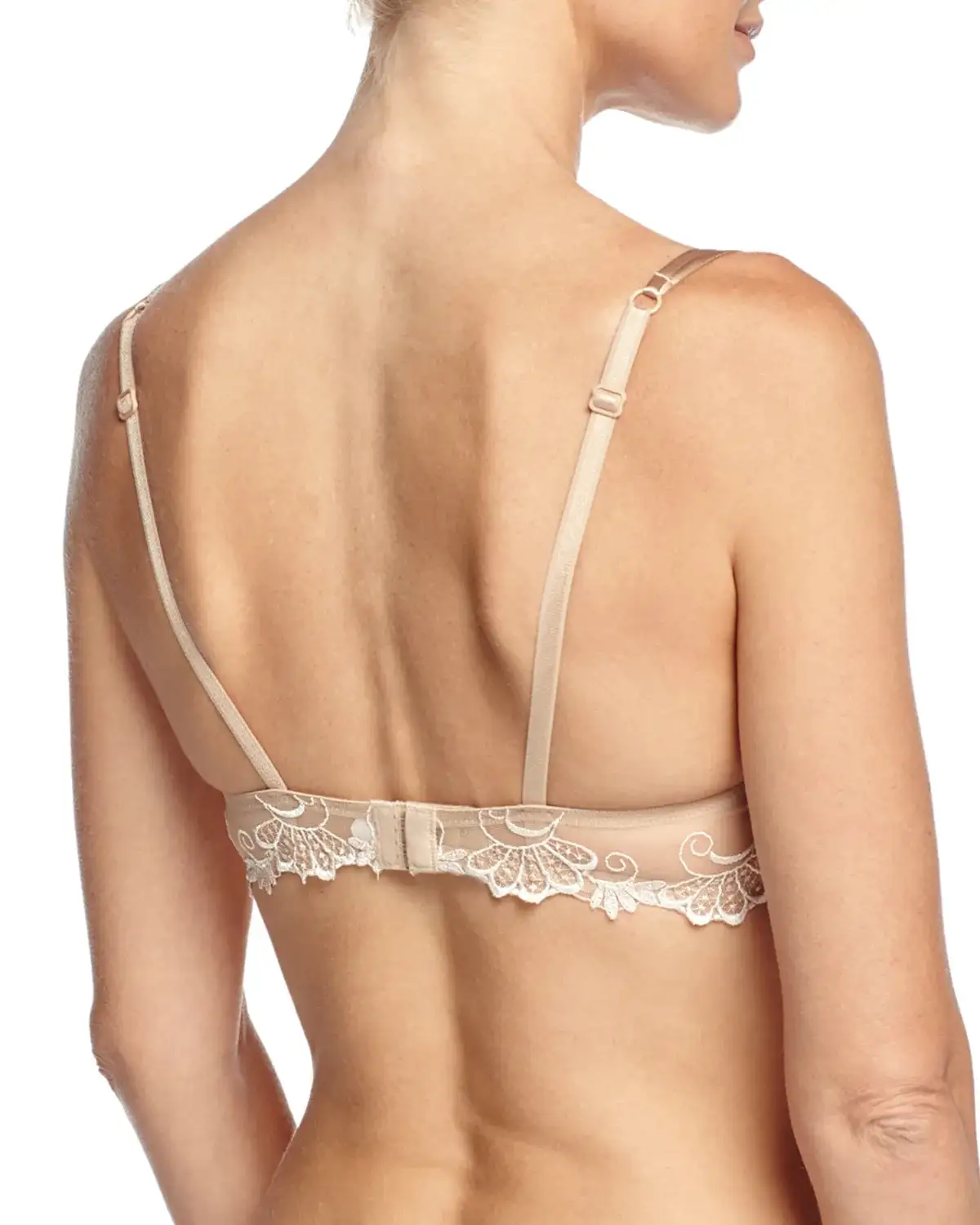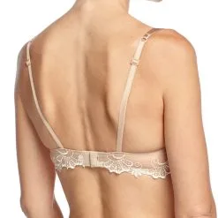 - Multi-part cup is unlined (unpadded), with an additional mesh side support panel for centering.