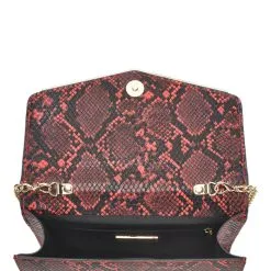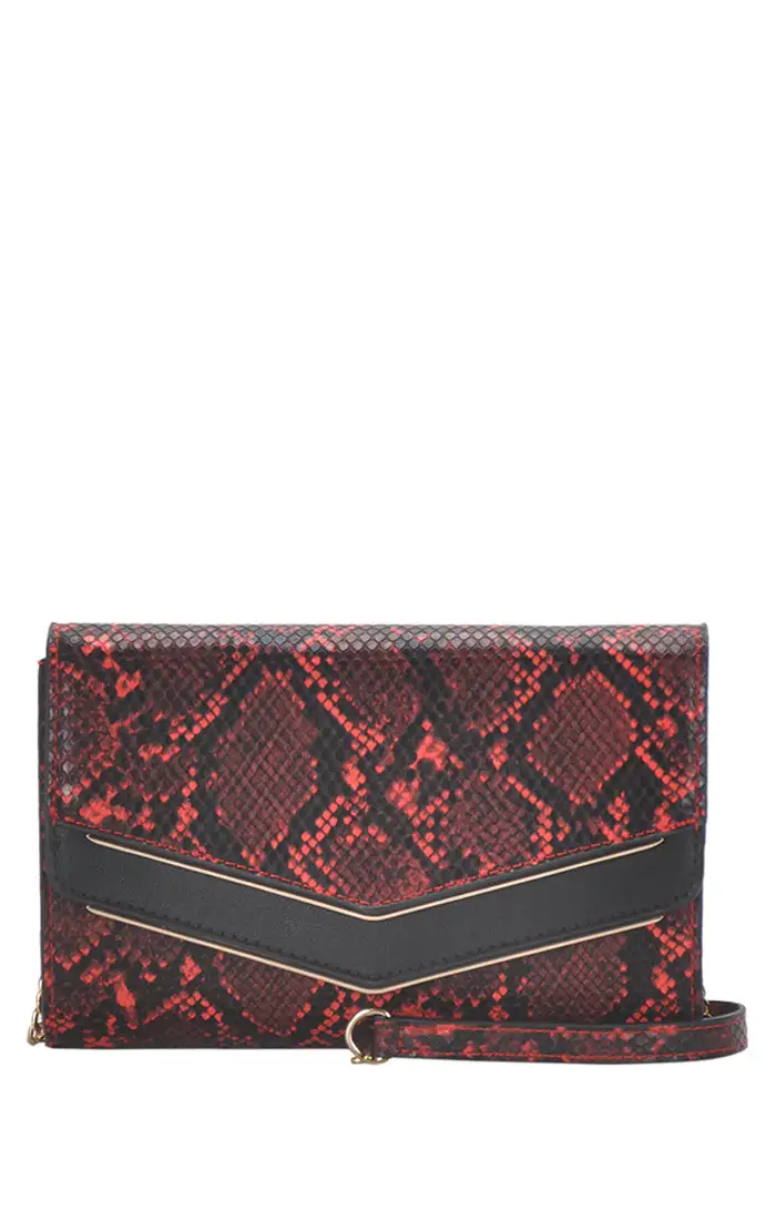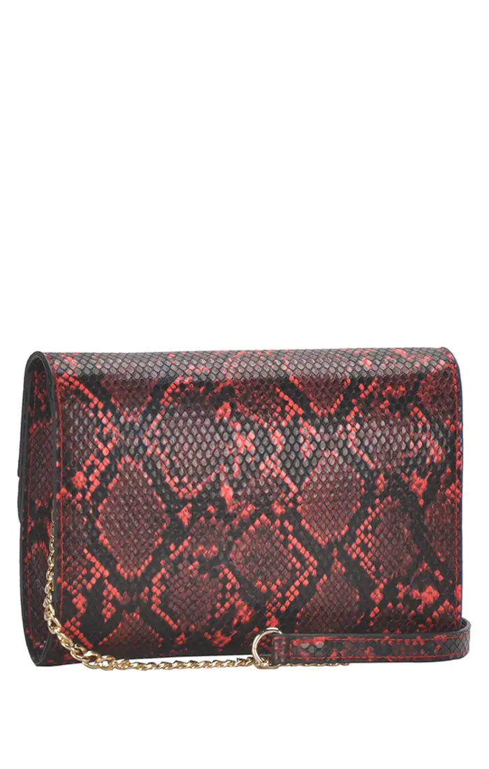 This chic envelope-style clutch is sure to turn heads with its unique design. Featuring red snake print with gold accents. Includes gold chain crossbody strap for more versatility!