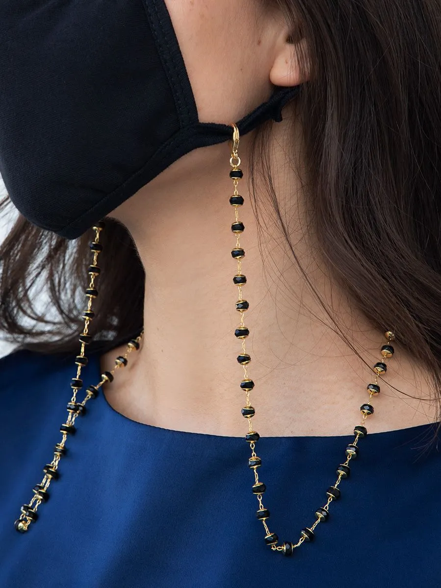 Eyeglass chain made from faceted, glass crystal beads. Comes with gold-tone accents and clear rubber loops to fit any pair of glasses. Open Closure -28′ Length -Nickel and Lead Compliant (Hypoallergenic)