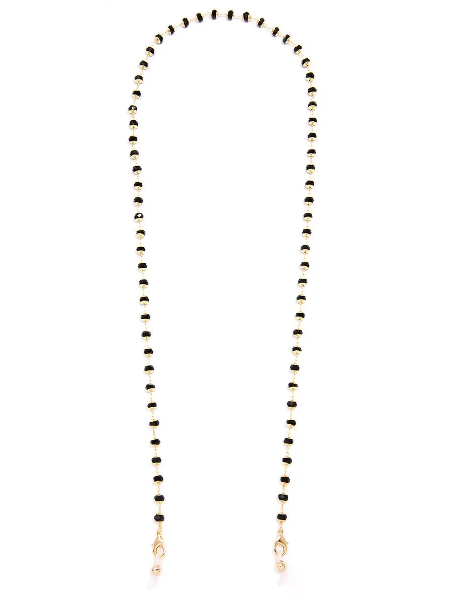 Eyeglass chain made from faceted, glass crystal beads. Comes with gold-tone accents and clear rubber loops to fit any pair of glasses. Open Closure -28′ Length -Nickel and Lead Compliant (Hypoallergenic)