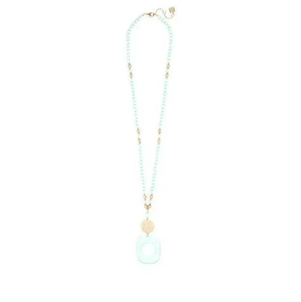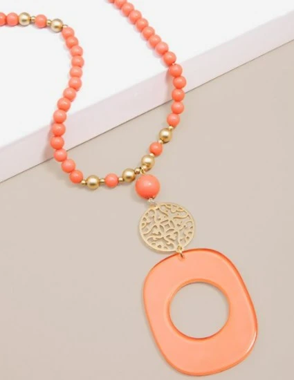 Long beaded necklace with a matte metal charm and an oval-shaped resin pendant.