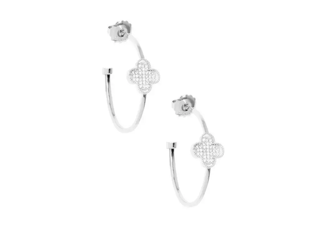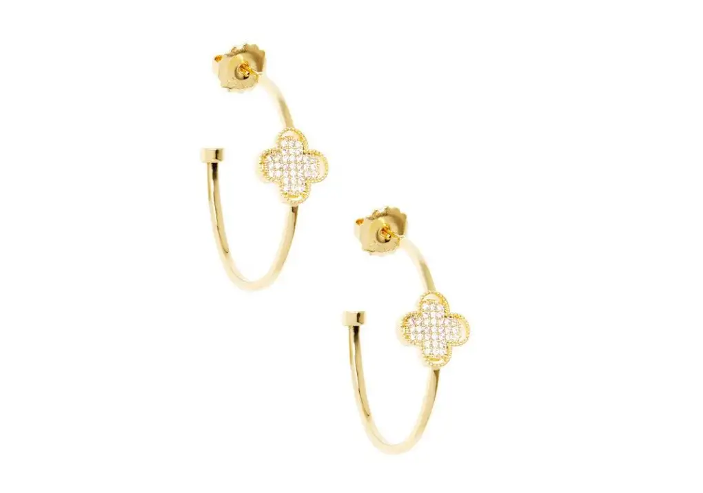 Hoop earring with front-facing clover embellishment encrusted with crystals.