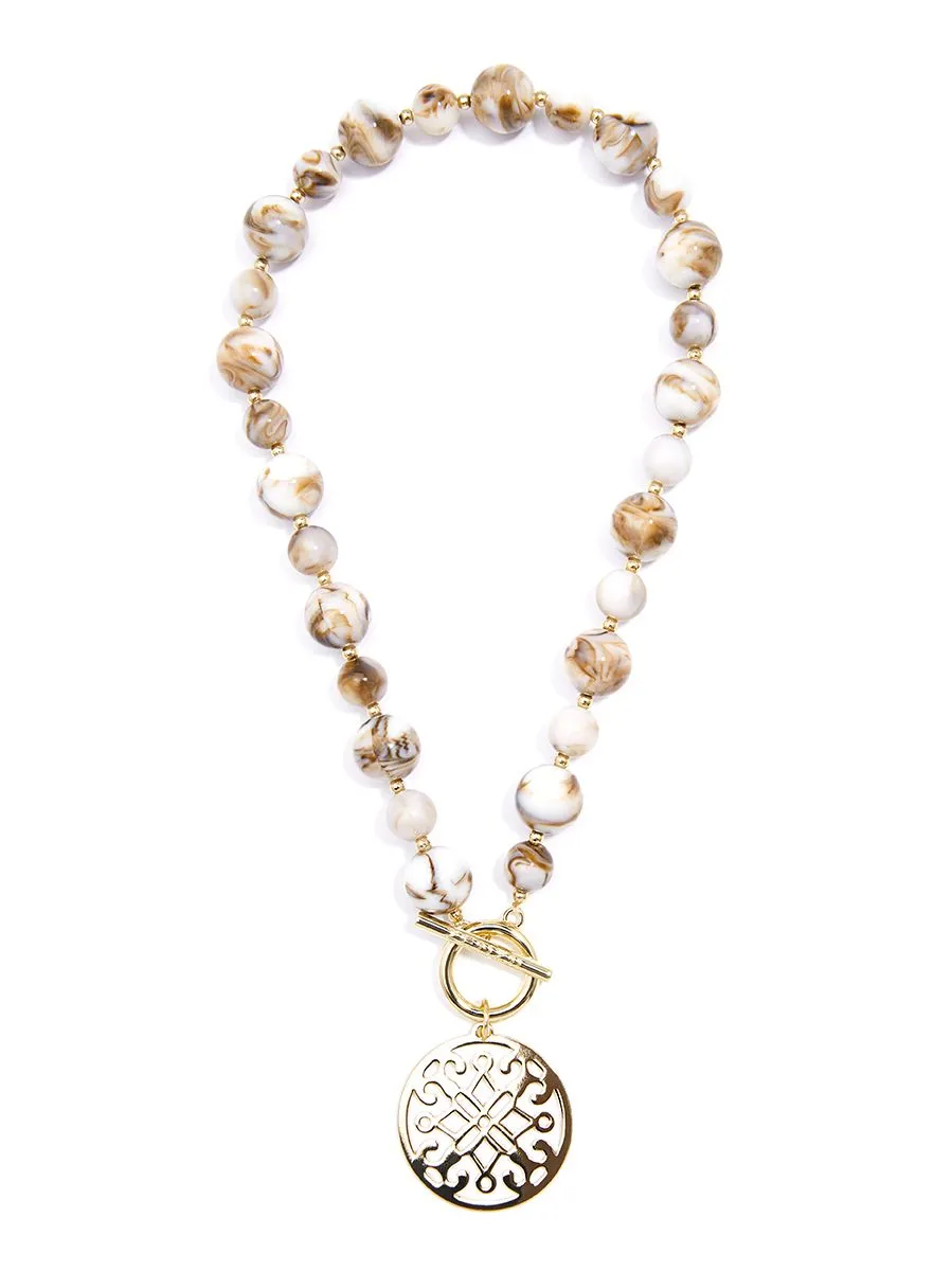 Chunky marbled beads collar necklace with a shiny metal toggle and Ornate pendant. -Toggle Closure -17′ Length -1.5″ Pendant Width -1.5″ Pendant Drop -Nickel and Lead Compliant (Hypoallergenic)