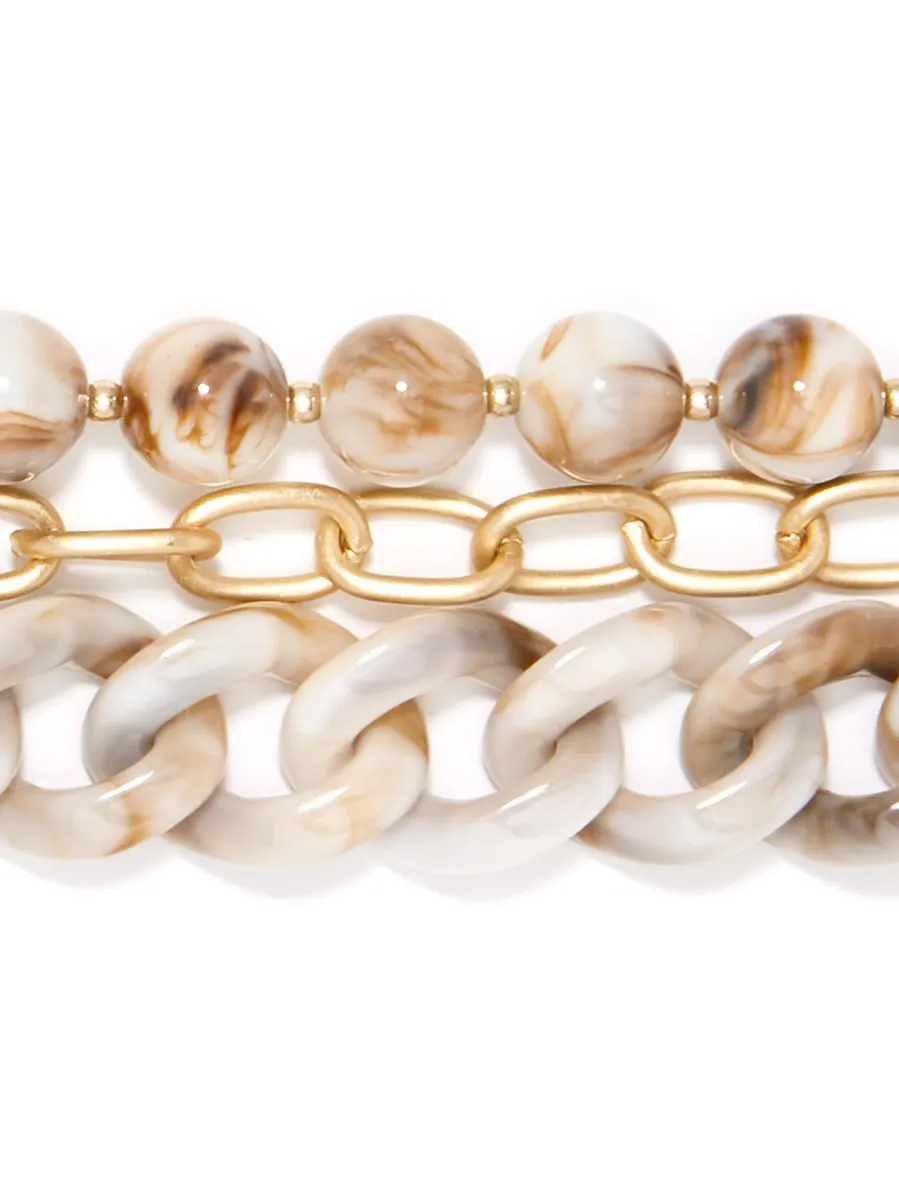 Wrap bracelet made of marbled resin links and beaded strands. Accented with matte, gold-tone accents and chains.Toggle Closure -1.5′ Extension -6″ Length -1.5″ Width -Nickel and Lead Compliant (Hypoallergenic)
