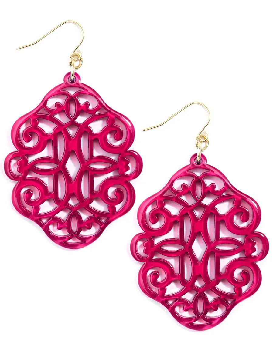Premium-grade, lightweight resin drop earring in an intricate, Regal Pendant cut-out design. Post Back -2′ Drop -1.5″ Width -Nickel and Lead Compliant (Hypoallergenic)